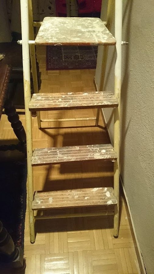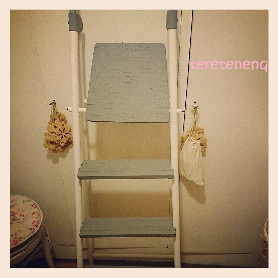 Encontré una escalera bastante estropeada en casa de un familiar, la lijé, la preparé y pinté con Chalk Paint Fleur y así quedó.