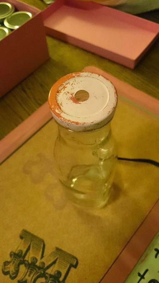 Las botellitas de cristal con tapa que podemos encontrar vacías en tiendas de menaje o llenas de leche o batido en el mercado. Al lavar las tapas a veces se les va el color, pues a pintarlas con Chalk Paint y como nuevas. Podemos decorarlas con una cenefa de papel adhesivo o con etiquetas o pegatinas.