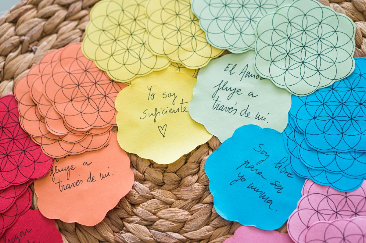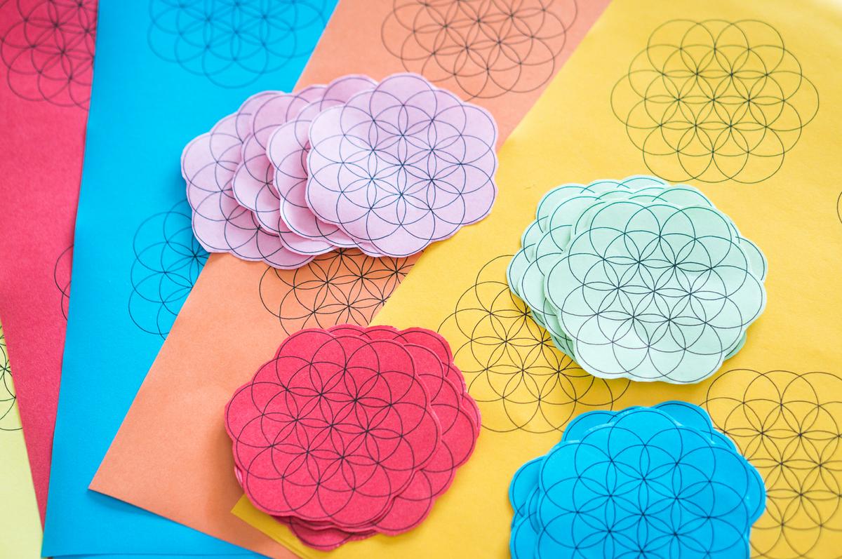 Imprime la plantilla de la flor de la vida en papeles de colores. Es recomendable imprimirlo en los 7 colores del arcoíris. Nosotros hemos añadido el color rosa también. ¡En todo caso, puedes elegir tantos colores como quieras!Añade afirmaciones positivas