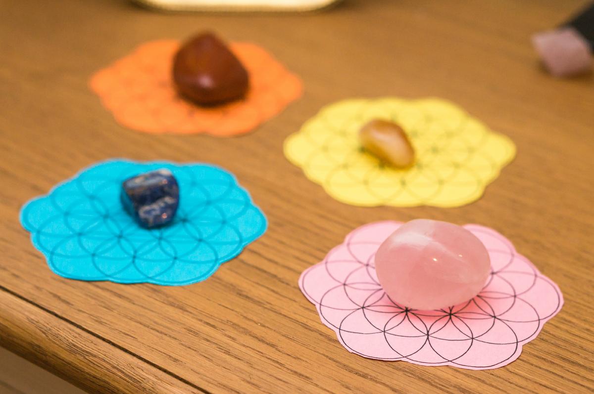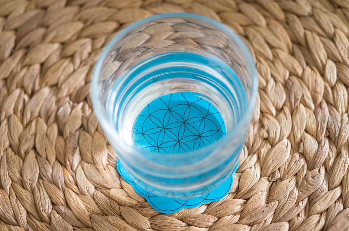 Puedes usar los diseños de la flor de la vida para cargar tus cristales. Asegúrate de que los colores de los cristales que eliges sean los mismos que los de la tarjeta de la flor de la vida que usas. De esta forma cargas tus cristales con el color y su significado (más la afirmación).3. Para cargar tu agua