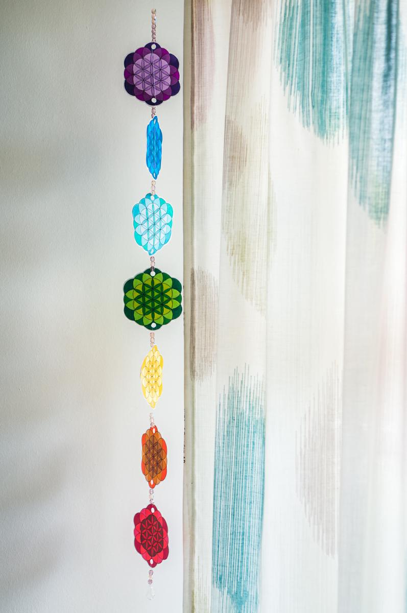 Puedes utilizar los diseños de la flor de la vida como posavasos. Úsalos para cargar tu vaso o tu jarra de agua con el color y su significado (más la afirmación). Asegúrate de dejar reposar el vaso en el posavasos durante 30 minutos o más antes de beber el agua.4. Haz tu propio móvil colgante de chakras