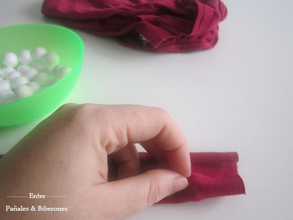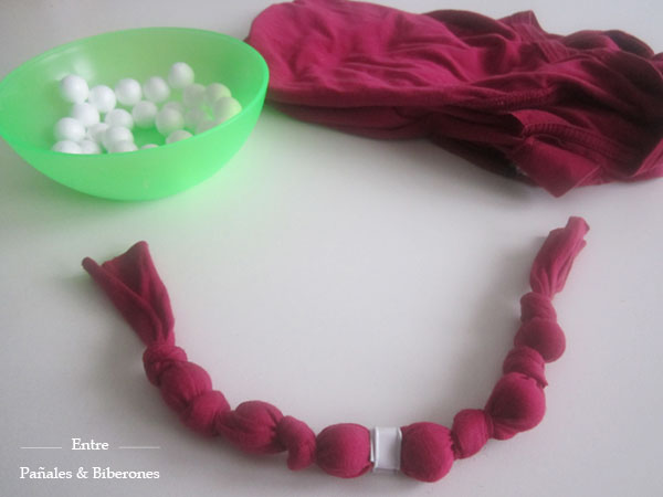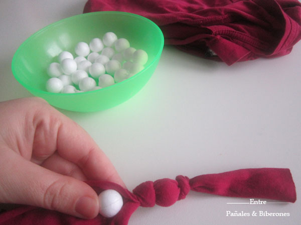 Cuando tengamos enrollada la tela alrededor de nuestra bola de poliestireno simplemente hacemos un nudo con la tela sobrante al comienzo de la bola enrollada...