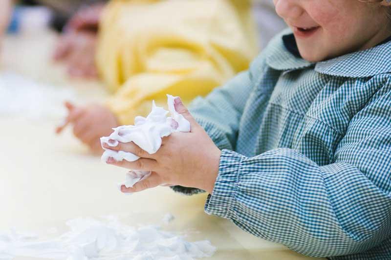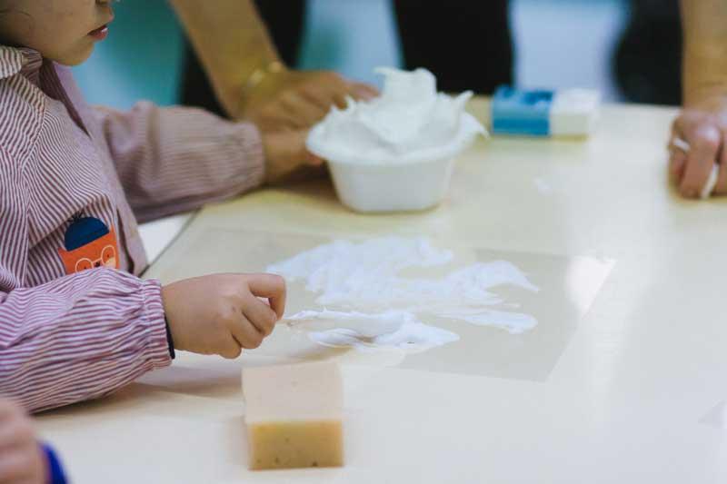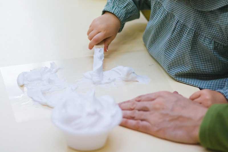 Ahora, tú serás la encargada/o de poner en el bol un poco de cola blanca y después llenarlo de espuma de afeitar.