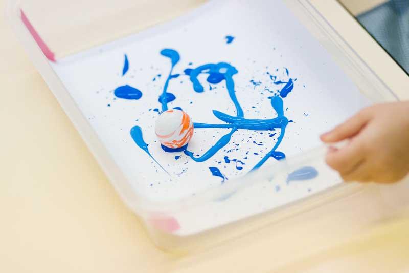 En esta parte tendrán que mover la bandeja para que de ese modo las bolas o las canicas vayan repartiendo la pintura por toda la cartulina. En esta parte del proceso podremos hablar de cuando llueve muy fuerte o graniza ya que el movimiento de las bolas y sobretodo el de las canicas dentro de la bandeja recuerda a esos sonidos.
