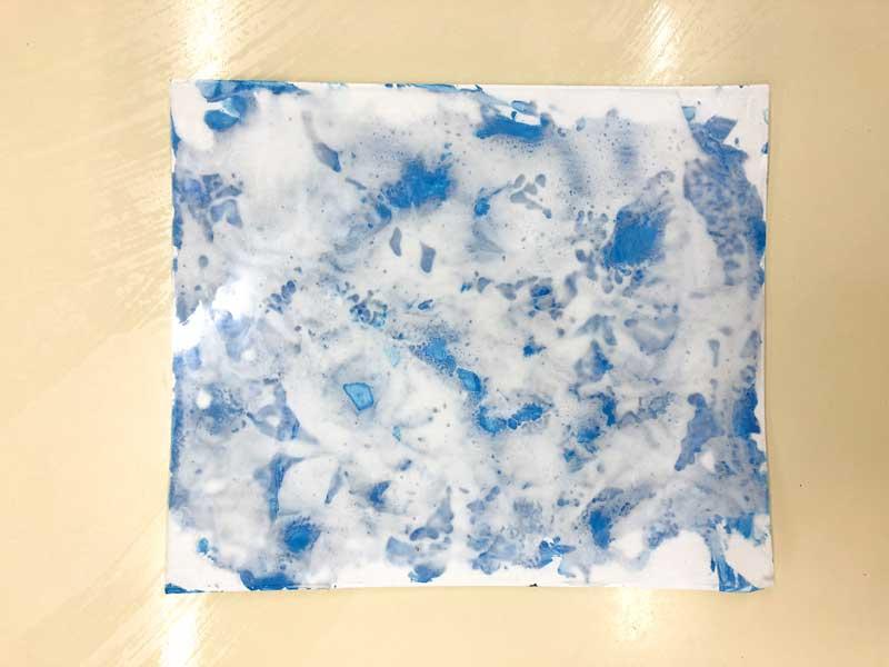 Ahora ayudándose del depresor o la cuchara tendrán que poner la mezcla de espuma y cola blanca sobre el folio de acetato para crear las nubes del cielo. Deja al peque que se entretenga jugando con la mezcla y cuando veas que se ha cansado dale la esponja para ir retirando el sobrante de la mezcla. Obviamente tendrás que ayudarlo para que quede algo de la mezcla sobre la hoja de acetato ya que se pondrá a pasar la esponja sin control.