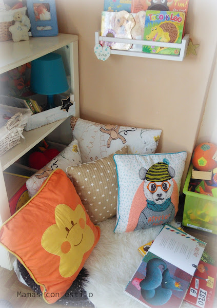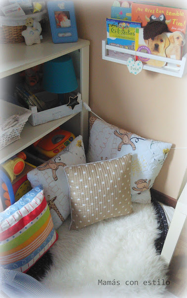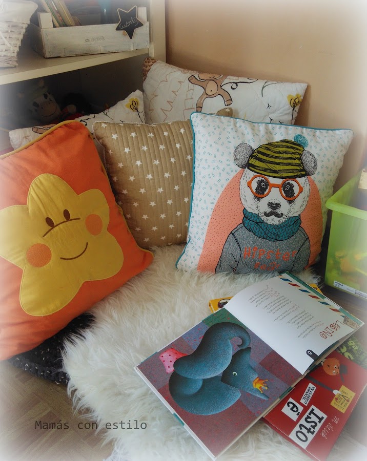 Lo que tienen estos rincones es que puedes ir cambiándolos facilmente, cambiando o añadiendo cojines, alfombras, sillas, estantes, etc, etc.