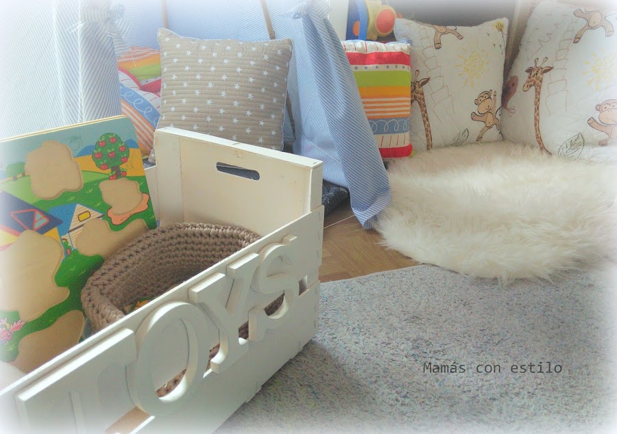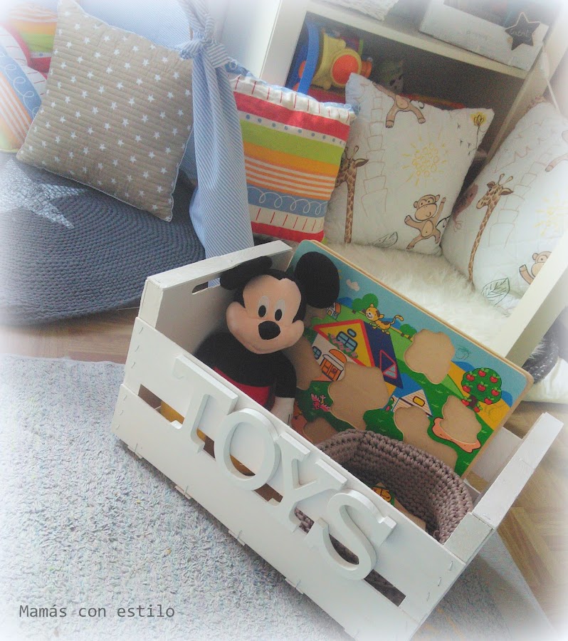 También aprovecho para enseñaros la caja para juguetes que les hice con una caja de fruta, letras y un trozo de tela de saco.