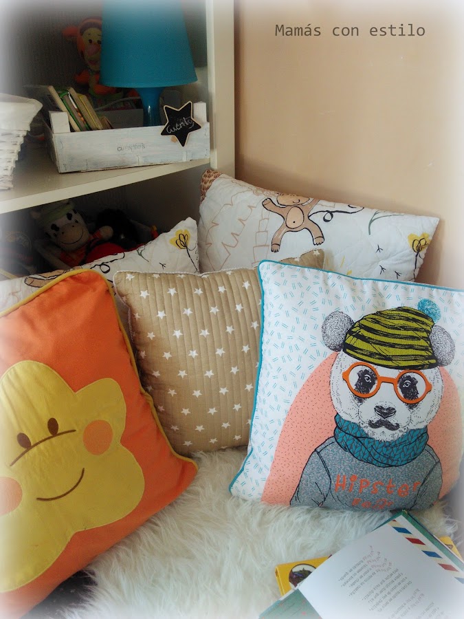 Los cojines los hice yo de algunos retales que encontré en el mercadillo y de fundas nórdicas antiguas de Ikea. El cojín tostado de estrellitas es de Zara Home, que va a juego con los edredones de sus camas, que pudisteis ver aquí.