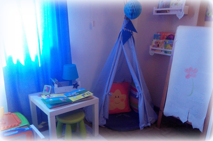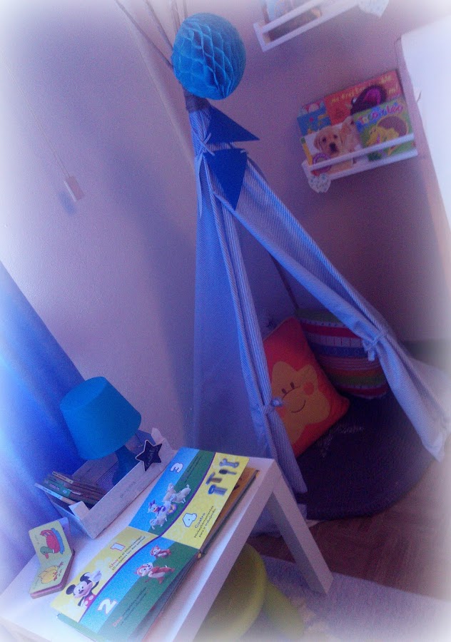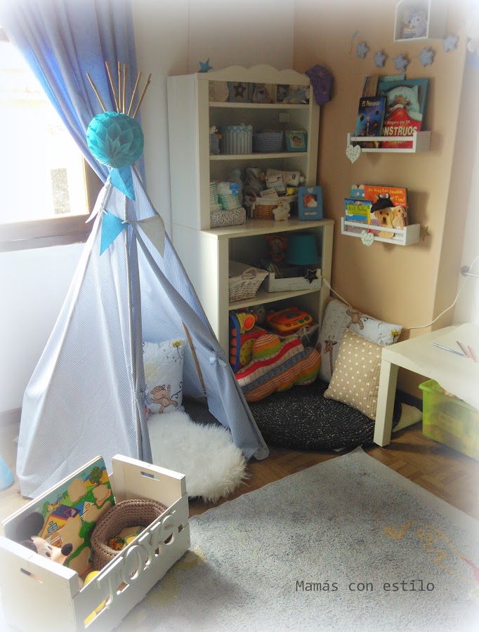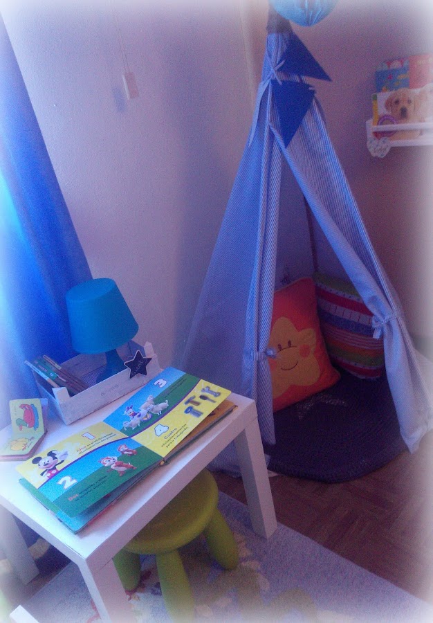 Nuestro rincón de juego y lectura incluye también el tipi, al que como os enseñé aquí, dimos un cambio para que fuese más cómodo y se integrase mejor en la habitación y en este rincón en especial, que para mi, es mi favorito.