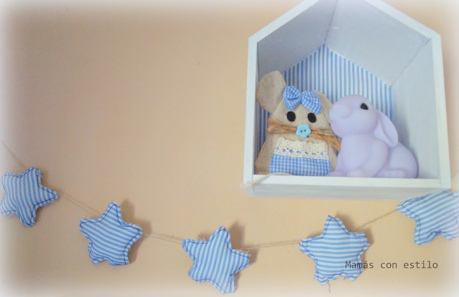 La casita de madera la colgué así porque tengo pensado poner otra un poco más grande a diferente altura. Esta es de Tiger, la pinté de blanco y el fondo lo cubrí con un trozo de tela que me sobró del tipi. La guirnalda de estrellas también la hice yo de los recortes de tela del tipi.