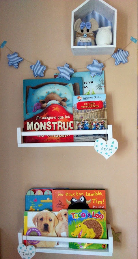 Para poder poner al alcance de Iván cuentos más pequeños y también para la lámpara para que puedan leer mejor, pinté de blanco una caja de fresas y el fondo lo cubrí con un papel de colores, de los que se usan en scrap. Quedaría mejor si hubiese lijado la caja, pero tampoco la quería perfecta ni de un blanco nuclear. La lámpara es el modelo Lampan de Ikea, súper económica y muy resultona, aparte es de plástico y la bombilla va cubierta con lo cual si se cae no hay problema. Y la pinza de pizarra en forma de estrella es de Tiger.