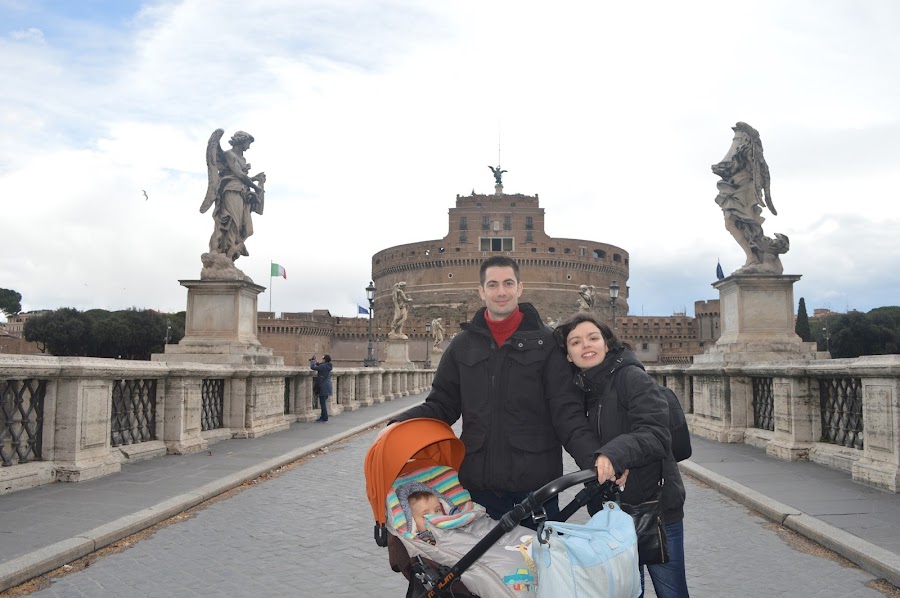 Salimos de Piazza Navona por la Vía Agonale y giramos a la izquierda por la Vía dei Coronari, giramos a la derecha en Vía dei Panico y seguimos recto hasta llegar al Ponte SantAngelo. Aquí nosotros hicimos una parada técnica para comer en un puestecillo de bocadillos y como el peque se despertó con bastante hambre le calentamos un potito con nuestro termo calienta-biberones, un gran invento que aprovechamos bastante en este viaje.