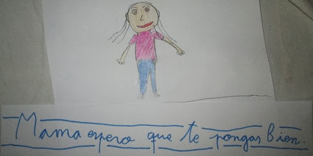 Y es que es en momentos como este que te das cuenta de lo buenos que son los niños, que saben reaccionar en situaciones anómalas y que deberíamos confiar un poquito más en su infinita bondad. Estos días que mi cuerpo ha dejado la forma en el colchón, mis hijos no han parado de entrar en la habitación a preguntar si ya estaba buena, a usar el fonendo que les ha dejado su padre y a inundarme de dibujos y mensajes tan preciosos como el que hoy ilustra la entrada del blog.