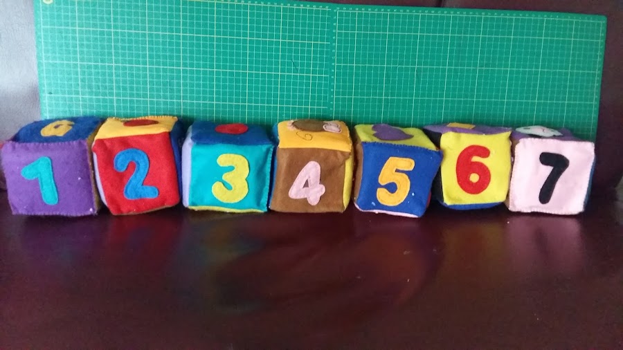 Como les explicaba, no son simples cubos de tela para hacer torres. Estos cubos están diseñados para enseñar muchas cosas a los pequeñines. Están elaborados de fieltro, aunque también pueden usar cualquier otro tipo de tela y el relleno es esponja, de esas que se emplean para elaborar colchones.