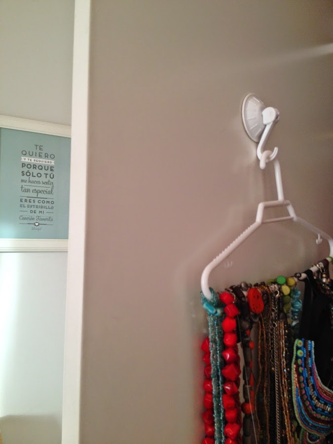 Solo se necesita una percha pequeña (yo le he pedido prestada una a la Princesa) y un colgador de los que hacen ventosa. Y la idea es tan tonta, y práctica, como colocar la ventosa en la parte interior de la puerta de un armario y sobre el colgador, poner la percha.