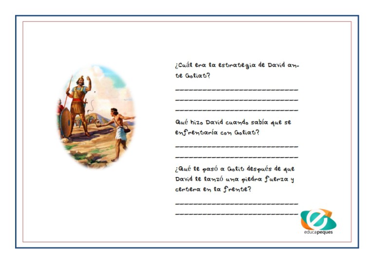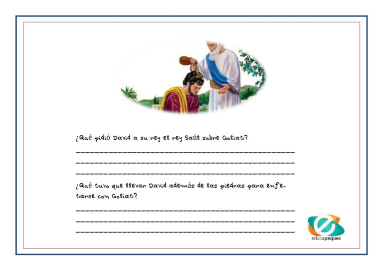 Entonces el rey Saúl que no le creía a David, por fin decidió dejar que David peleara con Goliat solo para ver qué podría hacer. Aunque tuvo miedo de que lo matara. David apenas tuvo el permiso del rey, se fue al río y consiguió unas piedras muy lisas. Luego se retiró al campo de batalla a encontrarse con Goliat.