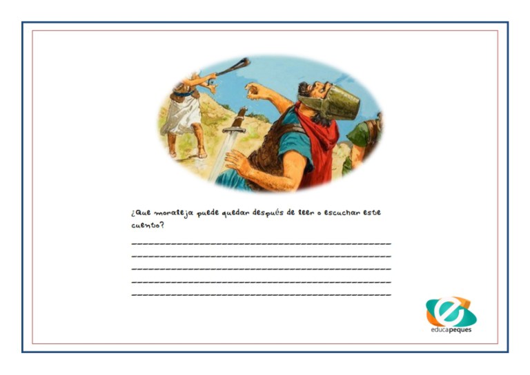 Este relato biblico se pone de manifiesto la fe, la fortaleza intelectual, el amor y corazón que le pongamos a todas nuestras luchas se imponen sobre la maldad y sobre la ventaja física, quienes se aprovechan de ella, sólo consiguen el fracaso, esta es la historia de David y Goliat.