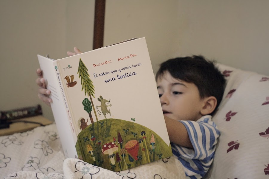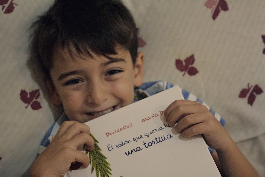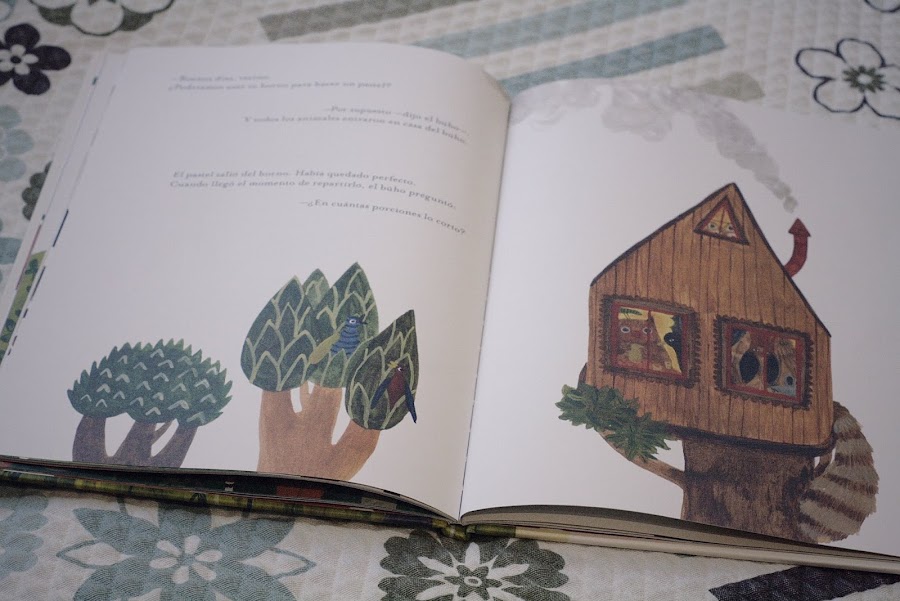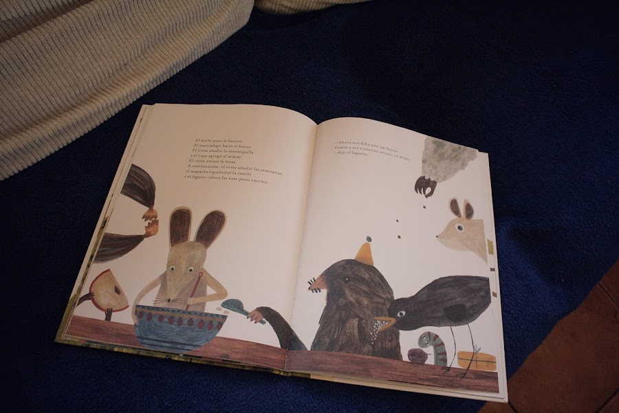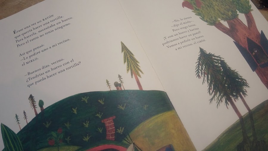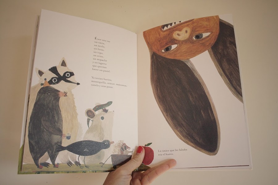 El ratón que quería hacer una tortilla tiene unas ilustraciones maravillosas, claras, de colores fuertes sobre un fondo blanco. Cada una acompaña perfectamente el texto y cargadas de simpatía en cada uno de los animalitos. Mis hijos jugaban a adivinar las emociones de cada personaje a través de sus caras, precisamente por la expresividad de cada uno de ellos. Logran captar la atención de los pequeños lectores y eso es un factor muy importante en el triunfo de un libro en esta casa.