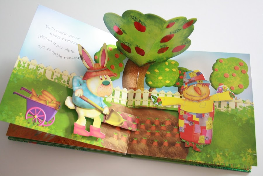 Todo el cuento esta compuesto por pequeñas frases en rima, que enseñan las diferentes actividades que se desarrollan en una granja, así como los animalitos que viven en ella, y la acompañan a la perfección unas coloridas y vivas imágenes en forma de pop-up. Es una gozada ver como se divierten manipulándolo y riéndose a carcajadas abriendo y cerrando sus paginas.