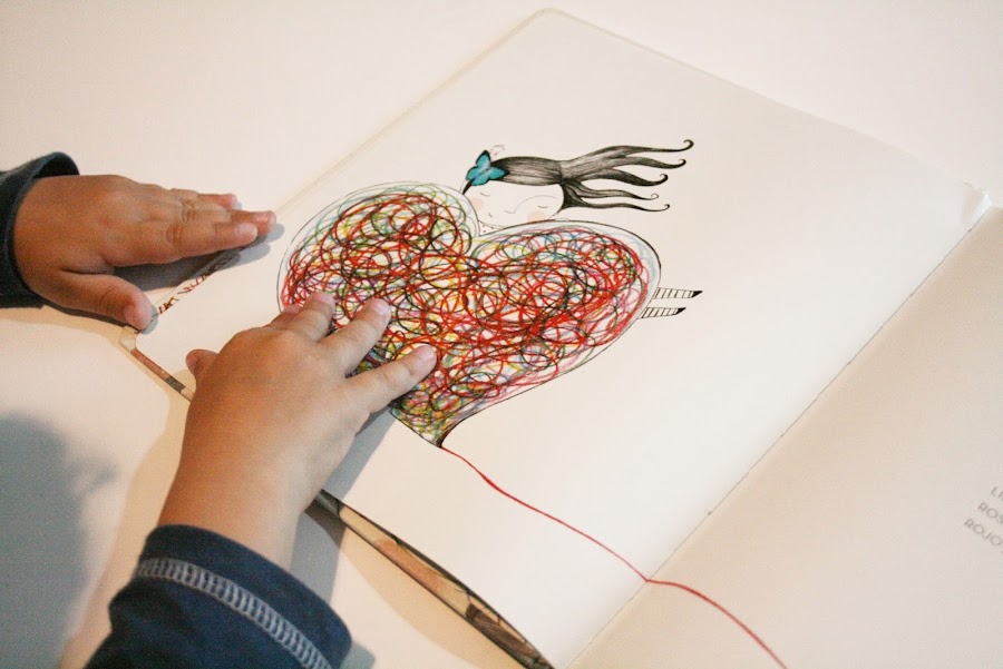 No debéis perder detalle a las ilustraciones de este cuento en donde siempre esta presente la forma de un hilo que nos conecta a cada persona en concreto.