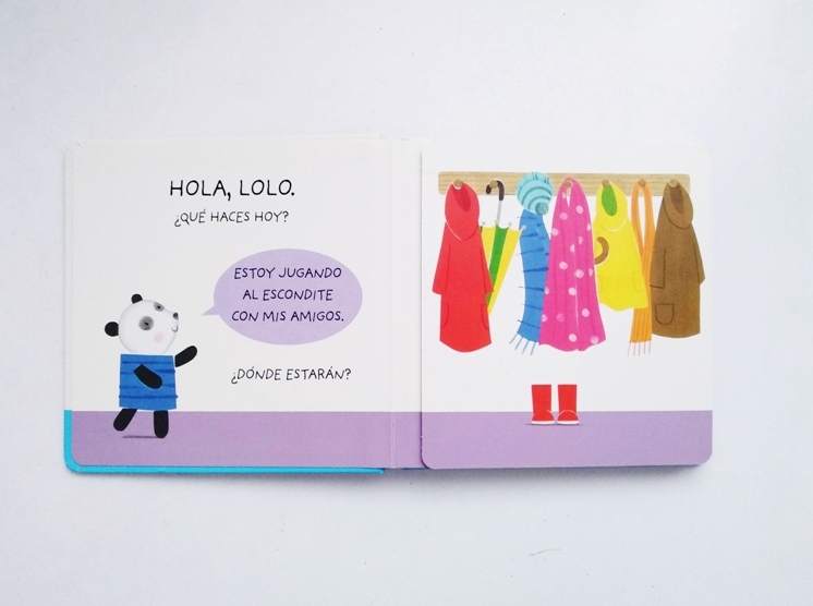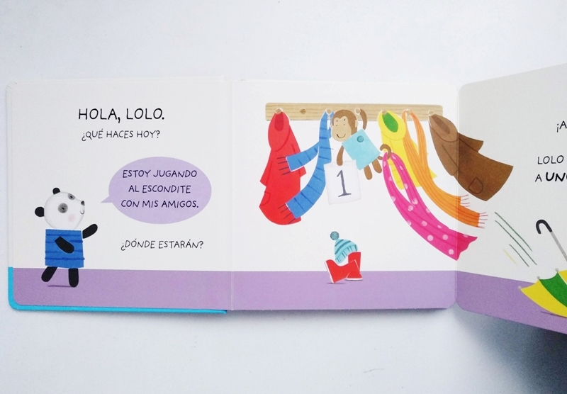 2. Cuando se abren las solapas, nos permite descubrir el lugar donde se esconden los amiguitos de Lolo. Por ejemplo, el primer sitio donde se esconde uno de sus amigos es un perchero. Esto da lugar generalmente a describir qué es un perchero y ya de paso, a decir en voz alta qué objetos hay colgados en el perchero de Lolo.