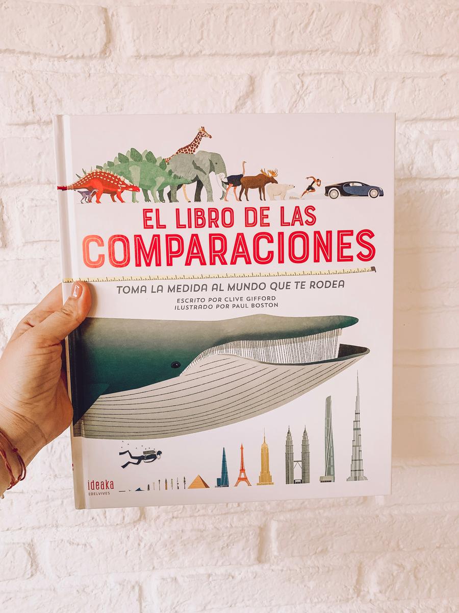 El libro de las comparaciones, lo podéis encontrar aquí. Un libro lleno de curiosidades y que desencadena muchísimas preguntas, retos y conversaciones de nuestros hijos sobre lo grande, altos y voluminosos que son los animales, construcciones y cosas que nos rodean. Un libro que seguro que os encantará mirar tanto a grandes como a pequeños.