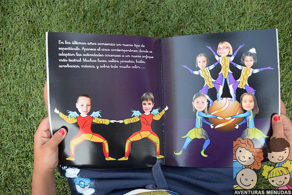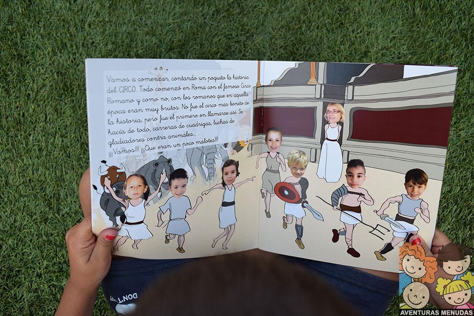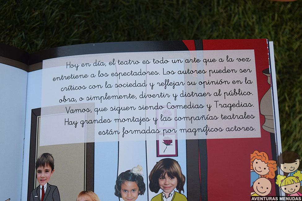En la primera hoja aparece la profesora y una lista con el nombre de todos los niños de la clase, así como una especie de dedicatoria en la parte superior. En cada página del cuento se va analizando la historia primero del circo, luego del teatro y por último del cine. En cada una de las páginas, se ilustra un momento histórico de dicho espectáculo, con personajes ambientados en la época.