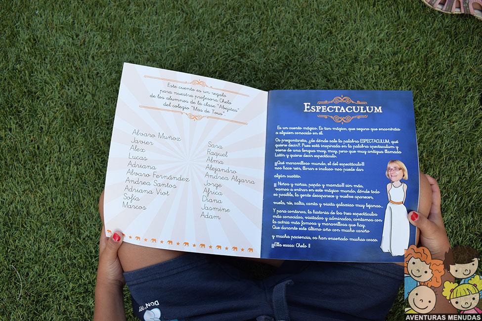 En el caso de regalos para profesores, tiene 4 cuentos especiales que se pueden personalizar con los niños y profesor/a de la clase. Son: El pirata pocabarba, La gran misión, El secreto del dragón y Espectaculum que es el que os venimos a enseñar en esta reseña.