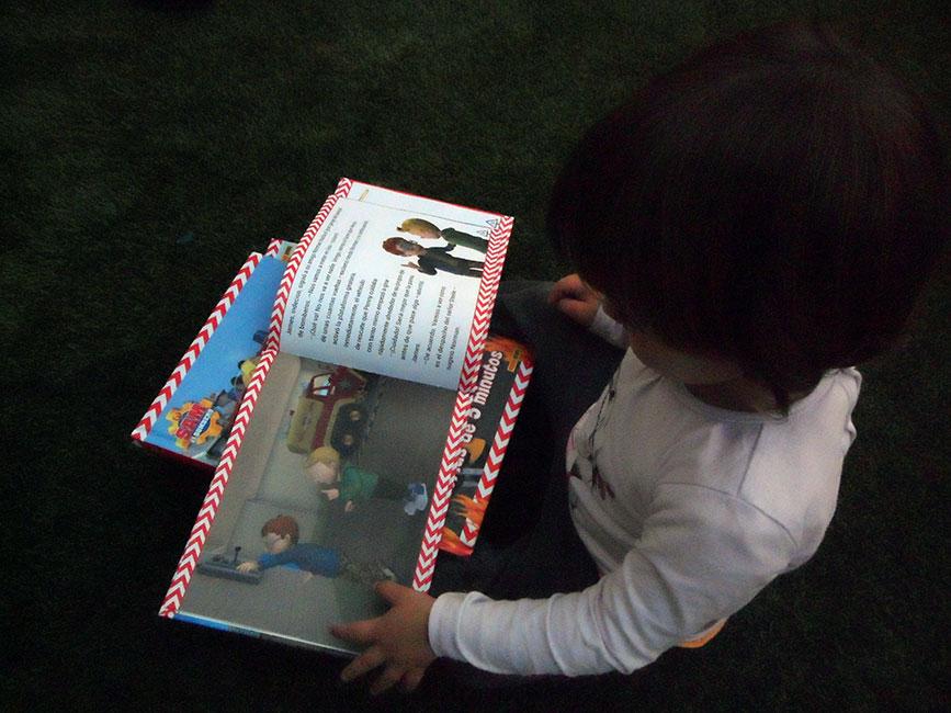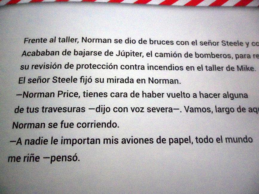 Como podéis ver aquí en el detalle, la letra es de imprenta en castellano y los textos son bastante extensos, pero siempre utilizando un vocabulario cercano a los niños. Lo único que hay que tener en cuenta, es que como narra no solo las situaciones, sino los antecedentes, los escenarios, donde están, qué pasa, etc., para que puedas situarte en la historia mientras lees, los niños tienen que ser un poco más mayores (4-5 años como indicaba antes), para poder seguirla bien.