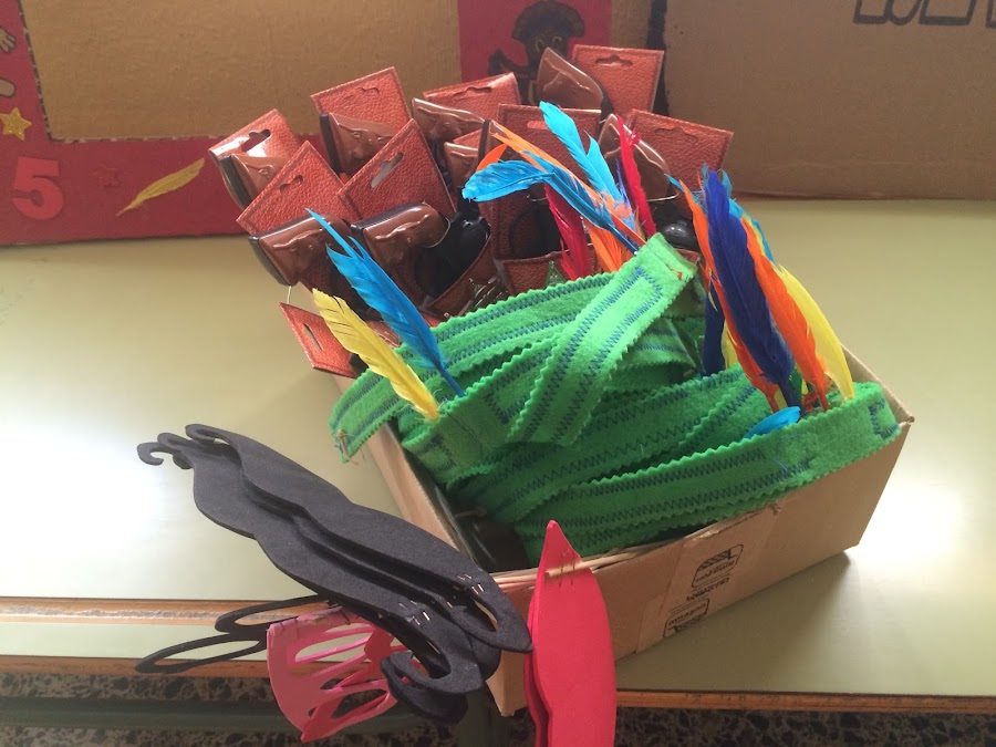 Quisimos hacer un photocall para que además de los peques, las mamás no se aburrieran y se hicieran fotos divertidas. Con goma eva hicimos gafas, bigotes y labios. Compré en las tiendas de chinos al por mayor pistolas de juguete y con fieltro hice diademas de indios, que fue lo que más éxito tuvo.