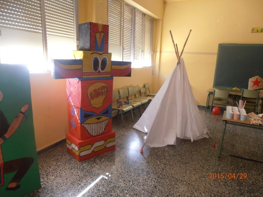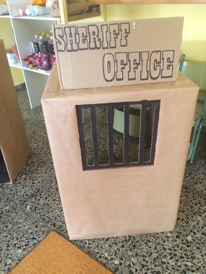 Hicimos un poblado vaquero e indio, con un tipi, un tótem, un salón y una cárcel del oeste y para que se sentaran a la hora de la tarta, pusimos unas mantas de estilo vaquero en el suelo.