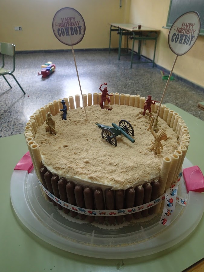La tarta figuraba ser un fuerte vaquero, así que con barquillos y figuritas de indios y vaqueros quedó muy resultona.