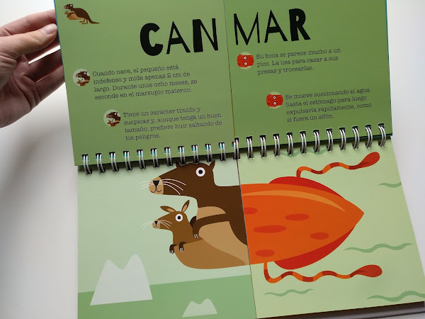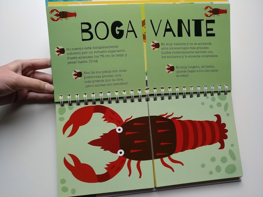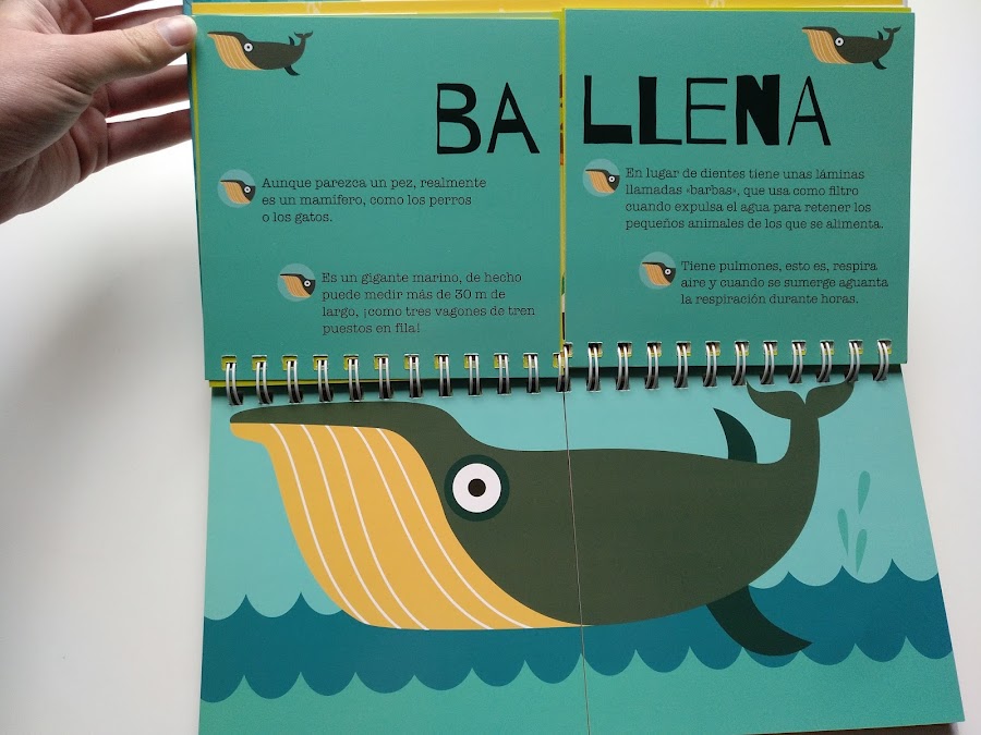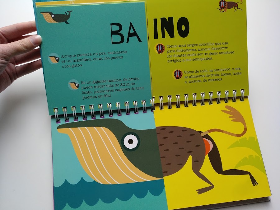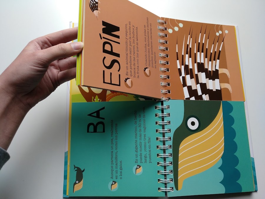En las mitades de las páginas que quedan a la izquierda de la espiral (o parte superior si lo ponemos en horizontal) encontramos el nombre del animal y cuatro características o curiosidades. Y en las de la parte derecha o inferior (según se mire) encontramos el dibujo del animal.