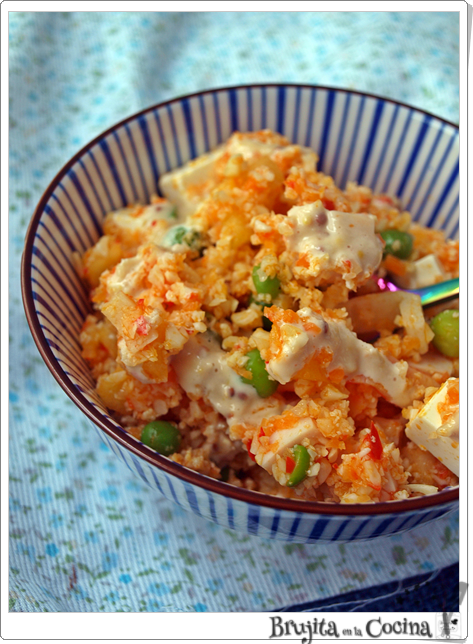 Esta forma de comer coliflor es más fresquita de cara a los días pasados de calor que hemos tenido y los que nos vendrán cuando no nos entraba un puré y así además metemos algo de fruta, o incluso pescado o pollo, ideas mil.