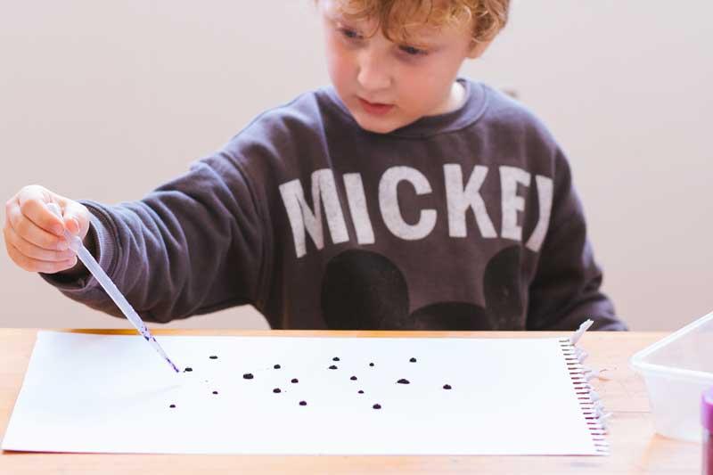 Cuando el peque tenga todo el papel lleno de gotitas o él o ella considere que hay suficientes pasaremos a la segunda fase de esta actividad de proceso artístico.