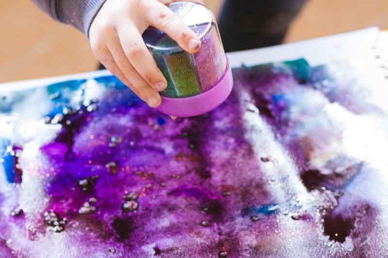 Después de disfrutar un ratito de este espectáculo pirotécnico puedes usar el último ingrediente de esta actividad, la purpurina. No hará falta que pongas ningún tipo de adhesivo ya que los petazetas son caramelos y al derretirse harán la función del pegamento.
