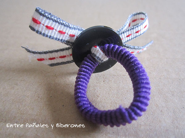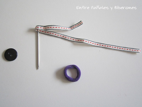 3. Asimismo, pasamos el lazo a través de la goma de pelo y volvemos a enhebrar, esta vez en el otro agujero del botón.