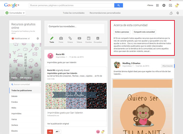 A continuación se te mostrarían en primer lugar las "comunidades que moderas", es decir aquellas que tú hayas creado, en mi caso, recursos gratuitos online, comunidad de Google+ en la de que te animo a participar, en ella compartimos un montón de freebies que estoy segura te servirán para muchos de tus proyectos !!