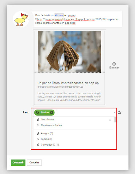 Otra cosa más, si compartes con tus círculos, es decir con tus contactos, se te mostrará además una nueva opción, la de "enviar un correo electrónico desde tu dirección a cada uno de los integrantes de dichos círculos".