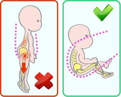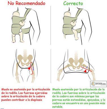 Lo correcto es que mantenga las rodillas del bebé superiores al trasero y reparta el peso por los muslos y la parte inferior de la columna.