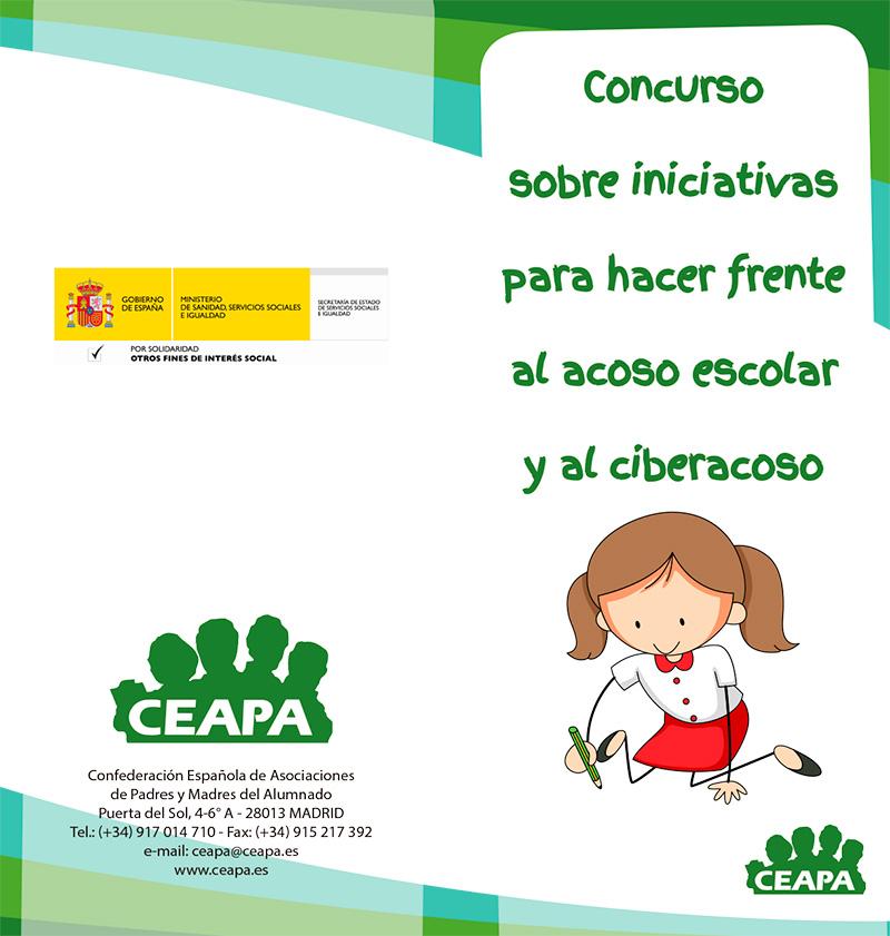 CEAPA. ha hecho pública la convocatoria de un concurso sobre iniciativas para hacer frente al acoso escolar y al ciberacoso. Está dirigido a niños, niñas y adolescentes. Su objetivo es promover la participación y el compromiso infantil en la creación de ideas e iniciativas que permitan prevenir el acoso escolar y el ciberacoso. Otra meta es crear un espacio para empoderar a los niños/as y adolescentes y darles un papel protagonista en la resolución de sus conflictos.