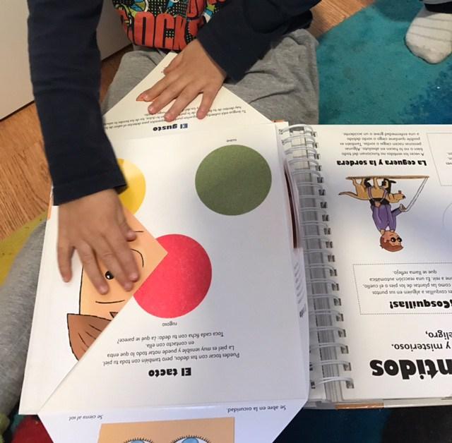 Es un libro pop up, con ventanas en todas sus páginas. Su formato es genial para niños porque sus pastas son duras y además está encuadernado en espiral lo que lo hace muy resistente.