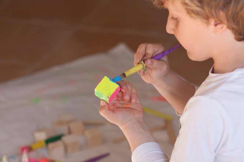 Con los cubos haremos lo mismo, pintaremos todas las caras excepto una que es la que apoyaremos para que se sequen y cuando estén secos pintamos la cara que falta.