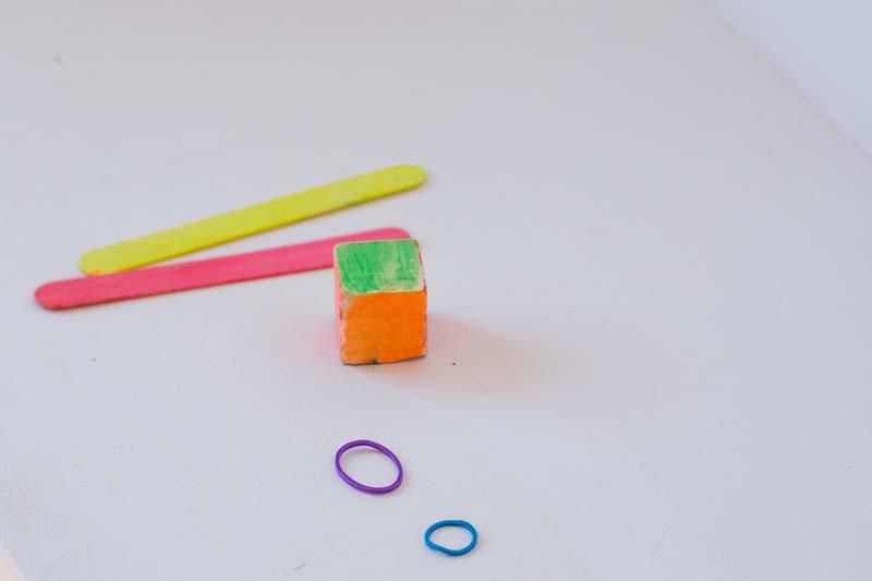 Necesitaremos 2 depresores de madera, un cubo y 2 gomas elásticas.