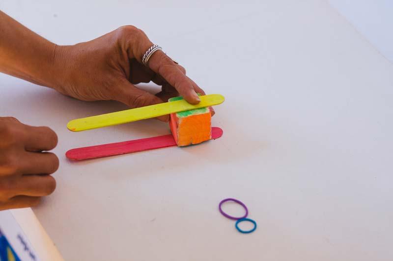 Coloca encima, en la parte izquierda de uno de los depresores el cubo de madera dejando un trozo de depresor de 1cm más o menos a la vista. Ahora coloca el otro depresor encima del cubo, que quede paralelo al otro depresor, sujeta con una mano y con la otra pon una de las gomas envolviendo los 2 depresores por la parte izquierda. Es muy importante que no sueltes porque te saltarán, ahora tienes que poner la otra goma al otro extremo de la catapulta que forman los 2 depresores y el cubo, de esta forma podrás soltar la catapulta sin que salte.
