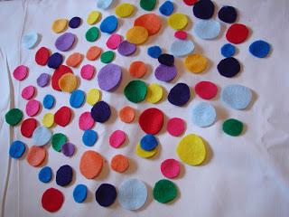 Ya casi la tenemos, ahora con los sobrantes de fielto, puedes cortar circulos, triángulos, o cualquier figura, que nos servirá para decorar alrededor de la estera.