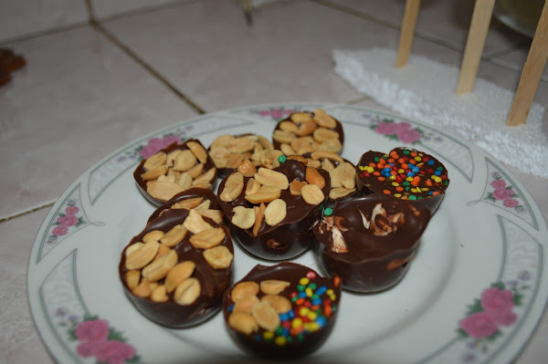 Por último, hemos preparado algunos chocolates con un poquito de todo. Yo sólo tenía el molde para hacer beso de mosa, así que he rellenado con un poco de chocolate, luego agregué maní, después eche un poco más de chocolate y finalmente masmellos o grajeas. (en realidad combiné con lo que tenía) A la refrigeradora y listo!