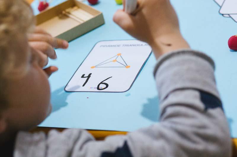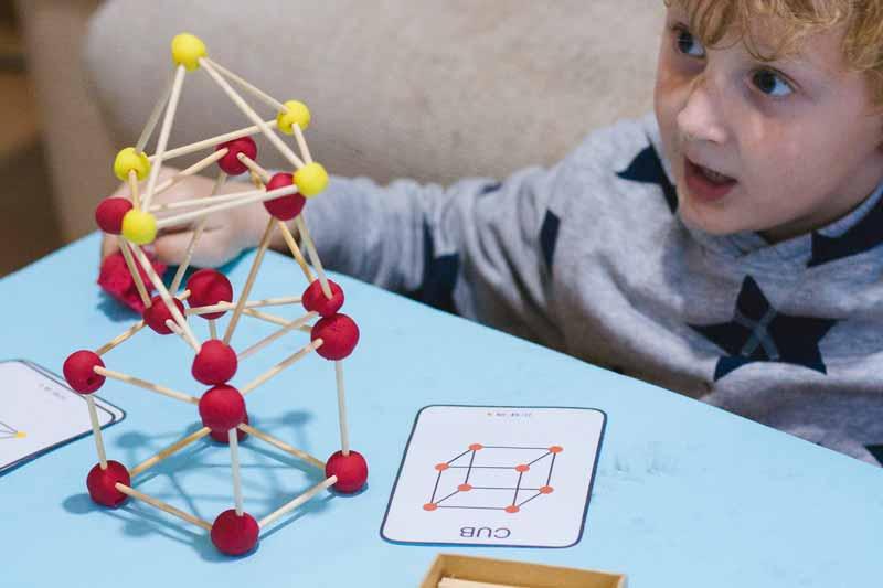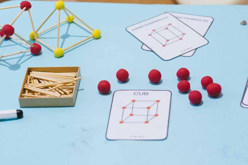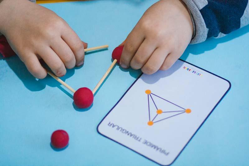 Una buena forma de empezar es diciéndole que cuente cuantas bolitas y cuantos palitos necesita para construir la figura geométrica. Marc por ejemplo, empieza contando los vértices, que en las tarjetas están representados con círculos de colores. Una vez los ha contado hace las bolitas de plastilina que necesita y cuando las tiene hechas pasa a contar las aristas que serán los palos y los reúne. Por ejemplo para construir el cubo necesita 8 bolitas de plastilina y 12 palitos.