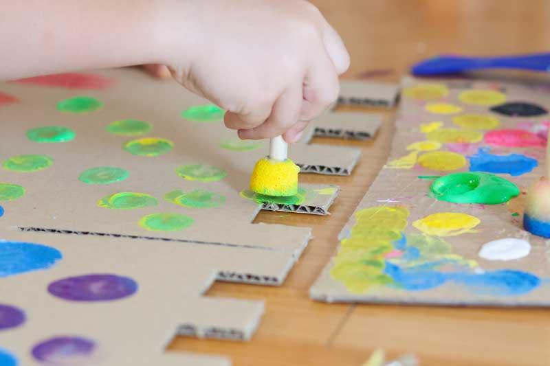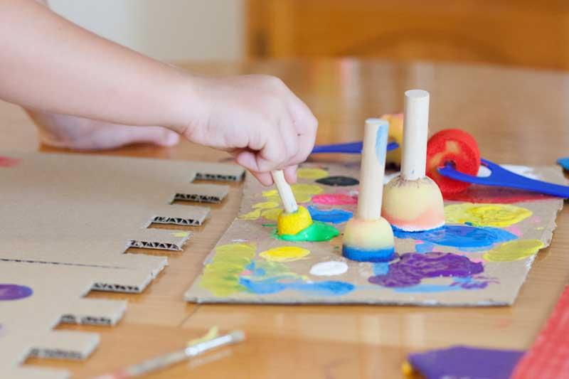 Una vez recortados los cartones anima a tu peque a que le de color. Dispón las témperas en platos y facilítale los diferentes instrumentos con los que podrá decorar sus cartones. No me he limitado a elegir una sola herramienta ya que presentarle varios formatos hará que su mente se plantee diferentes metas según la herramienta que utilice en cada momento.