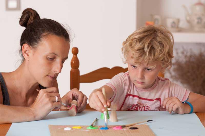 Primero tendrá que decorar una parte y después la de atrás ya que a la hora de montar el juguete se verán las dos caras del cartón. Mientras os esperáis a que se seque podéis empezar a pintar los muñecos de madera.